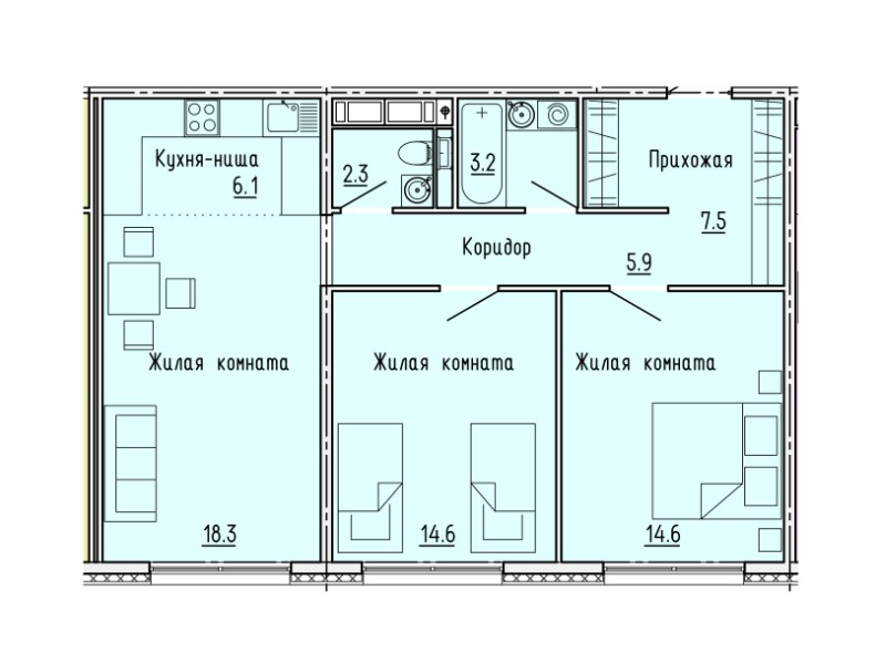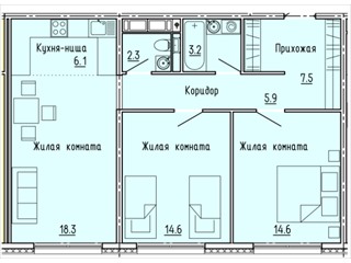 общая 72,5 м2, жилая 47,5 м2, кухни 6,1 м2 |