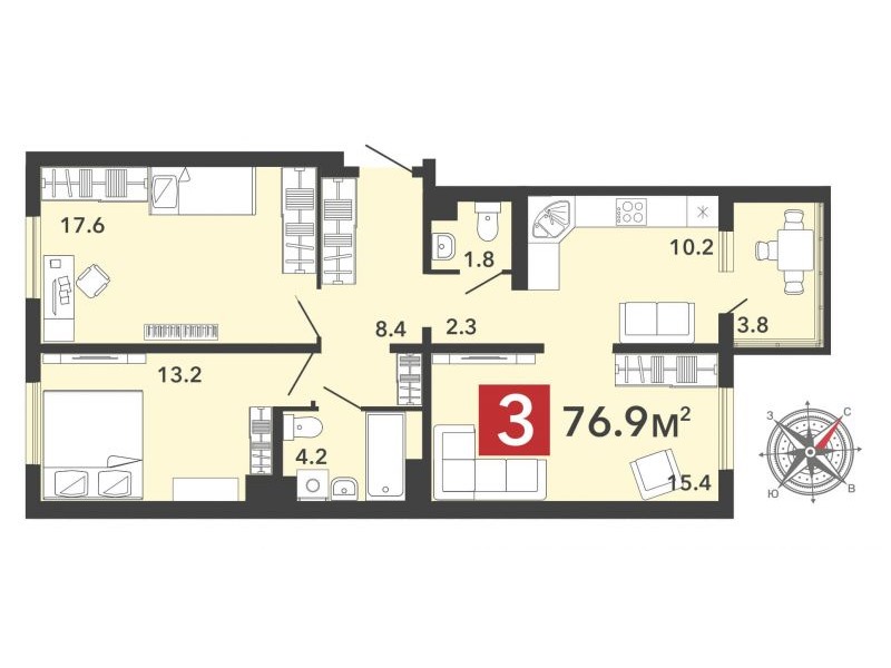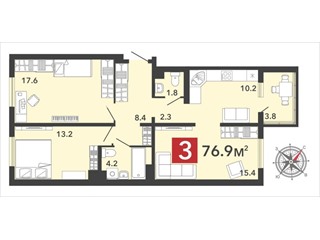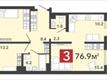 общая 76,9 м2, жилая 46,2 м2, кухни 10,2 м2 |