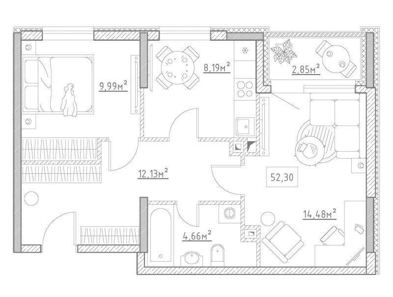 общая 52,3 м2, жилая 24,47 м2, кухни 19 м2 |