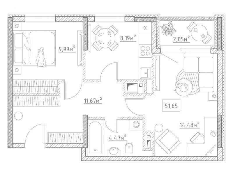общая 51,65 м2, жилая 24,47 м2, кухни 8,19 м2 |