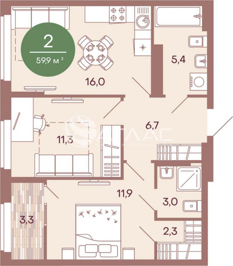 общая 59,7 м2, жилая 23,3 м2, кухни 16 м2 |