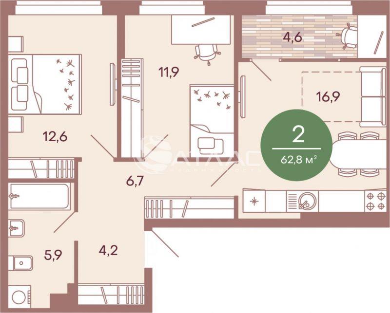 Площадь комнат – 11,9 кв.м, 12,6 кв. м,