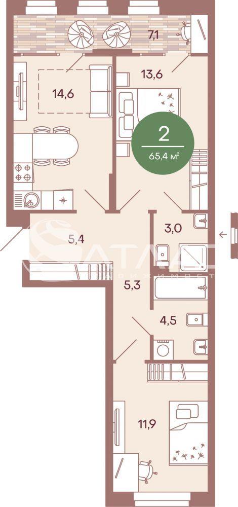 Общая площадь - 65,4 кв.м,