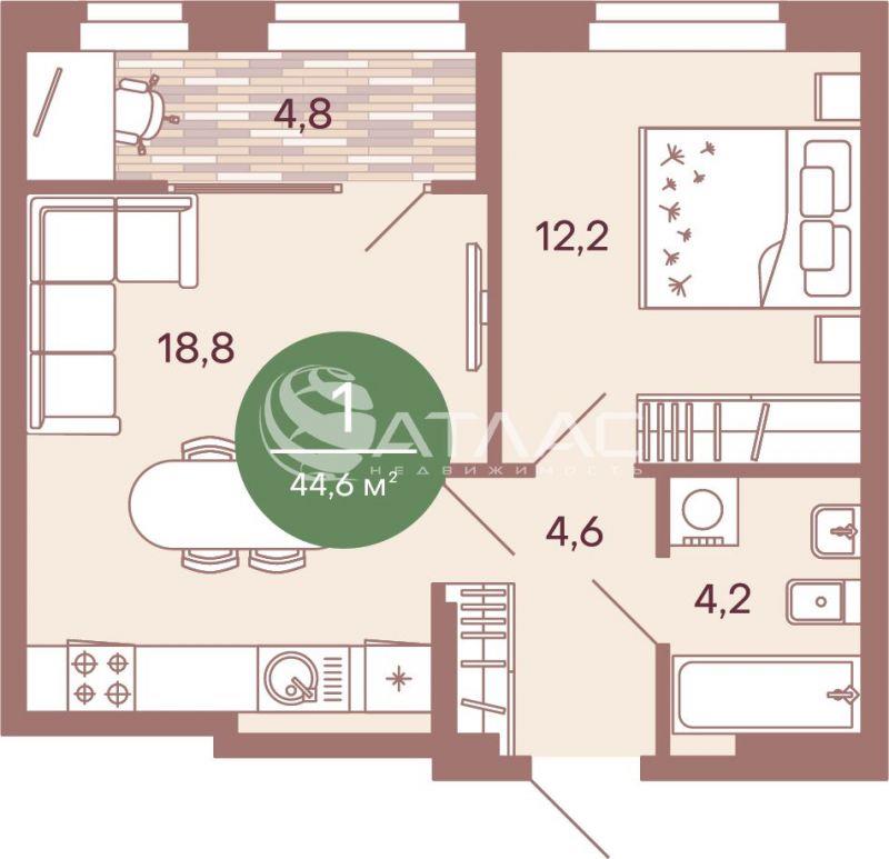 общая 44,6 м2, жилая 12 м2, кухни 18,8 м2 |