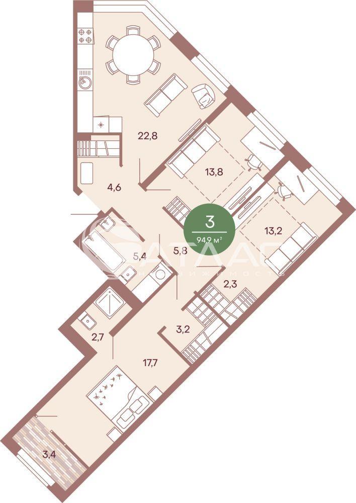 общая 94,9 м2, жилая 44,7 м2, кухни 22,8 м2 |